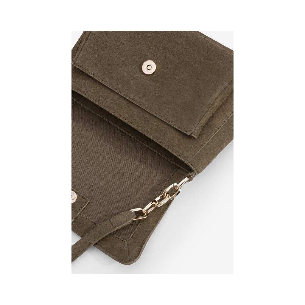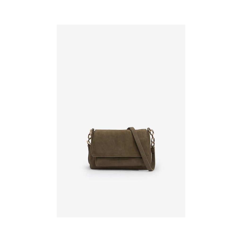 Bolso bandolera de ante, con bolsillo frontal y solapa con cierre magnético. Correa ajustable combinada con cadena.