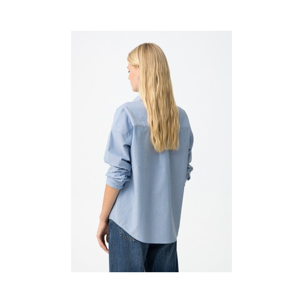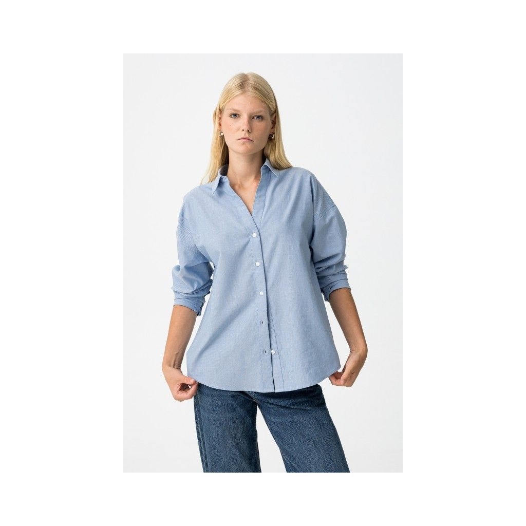 Camisa relaxed fit de popelina con abertura frontal y cierre de botones. Escote en V con cuello, manga larga con botones en los puños y bajo curvado.