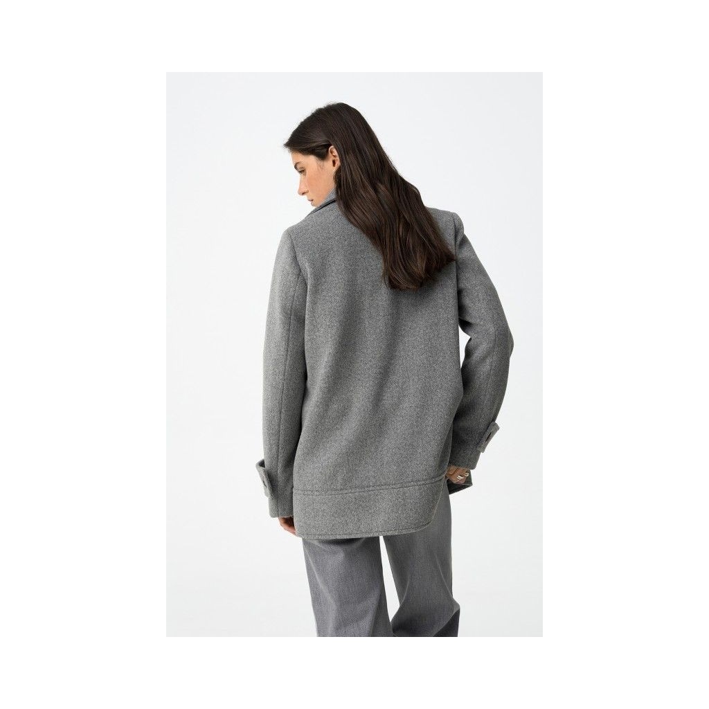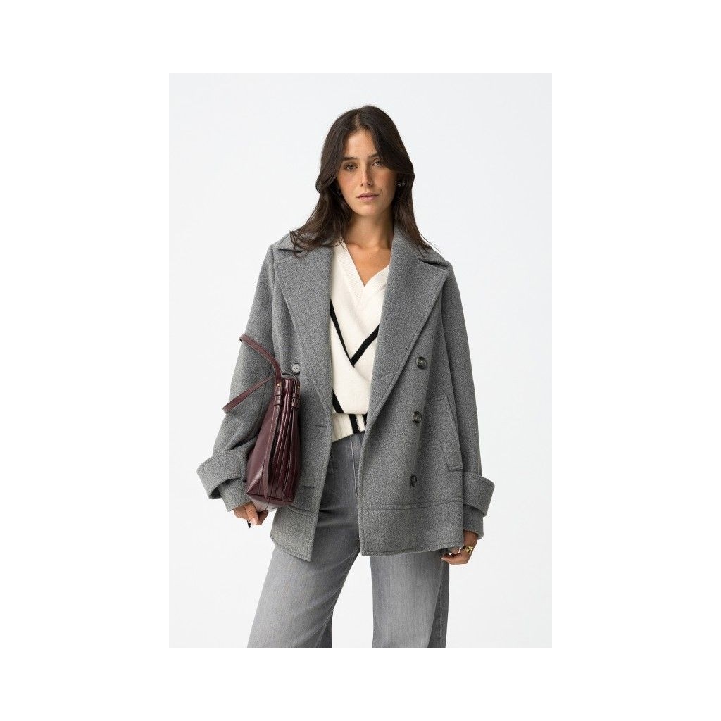 Chaqueta regular fit con doble botonadura. Solapa ancha y dos bolsillos laterales. Puños con tira decorativa y botón.