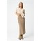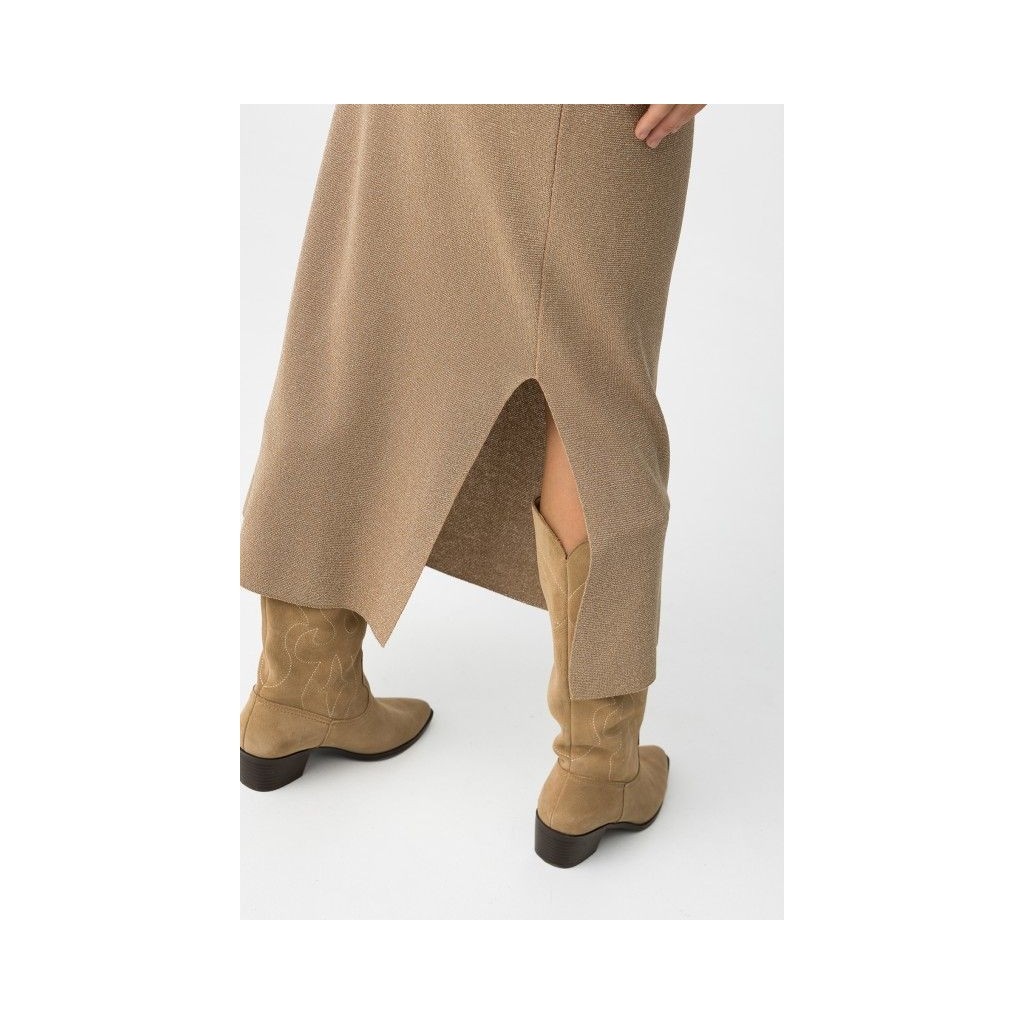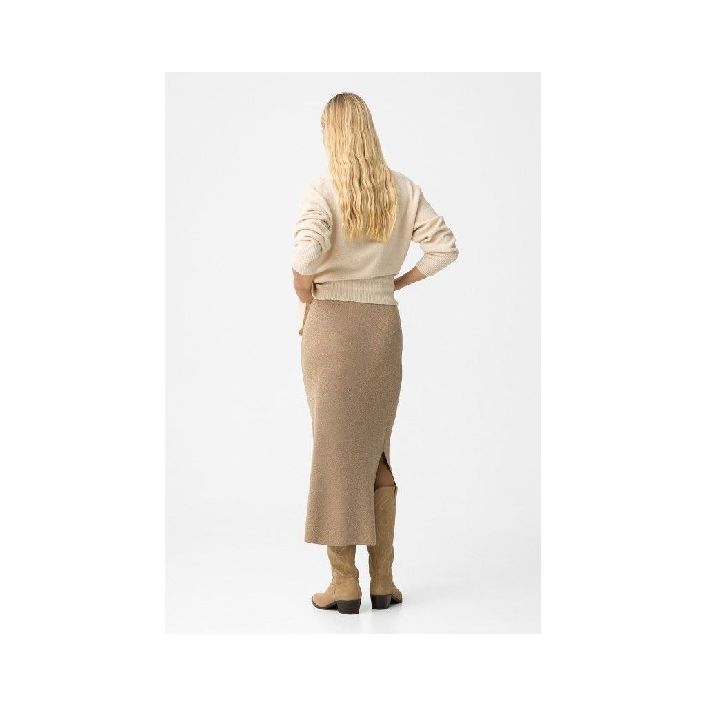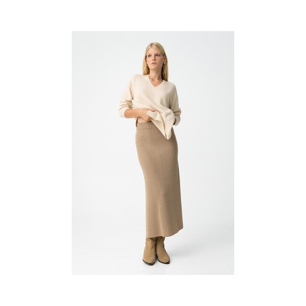 Falda midi de punto con hilo metálico integrado. Cintura alta elástica y bajo con abertura.