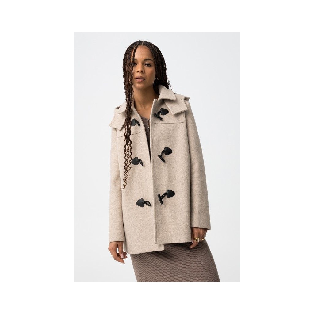 Abrigo regular fit con dos bolsillos, cierre alternado en la parte delantera y capucha desmontable. Cuello camisero y manga larga.