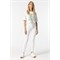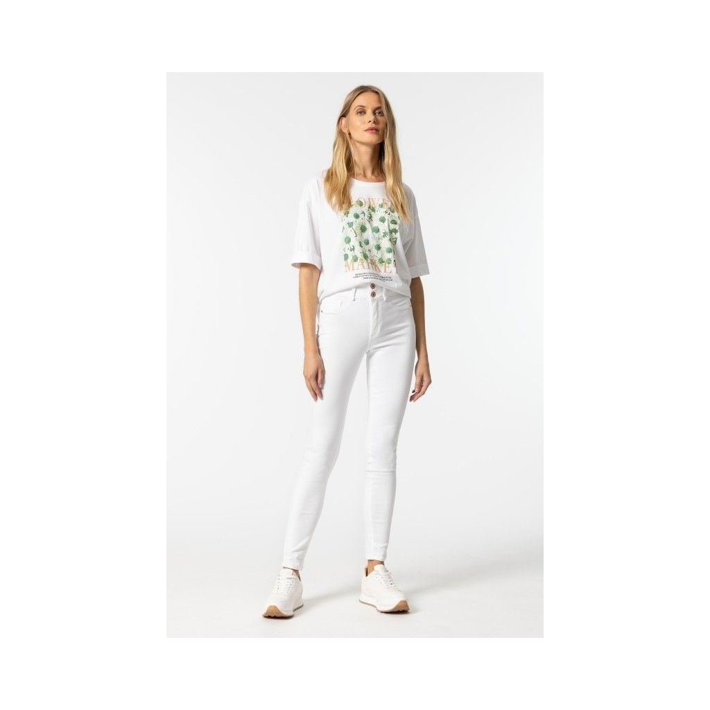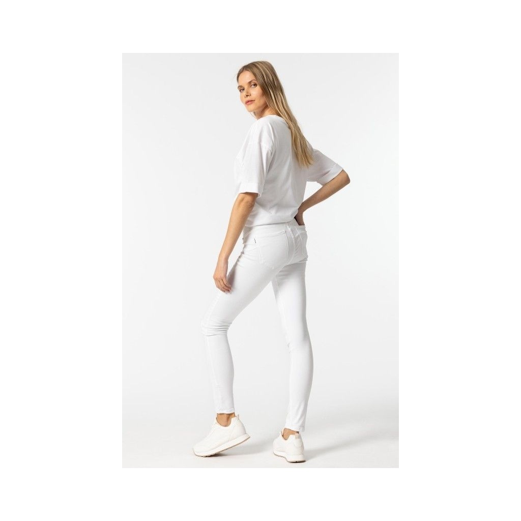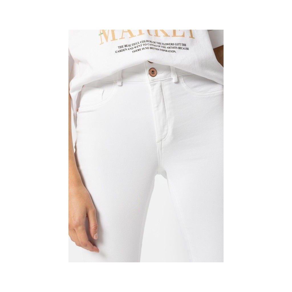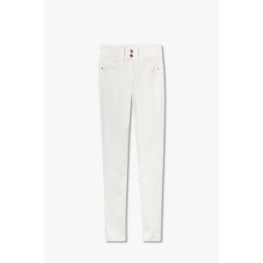 Jeans ajustados de tiro alto con tres bolsillos. Cierre frontal con cremallera y botones metálicos. Bolsillos falsos delanteros. Efecto push-up.