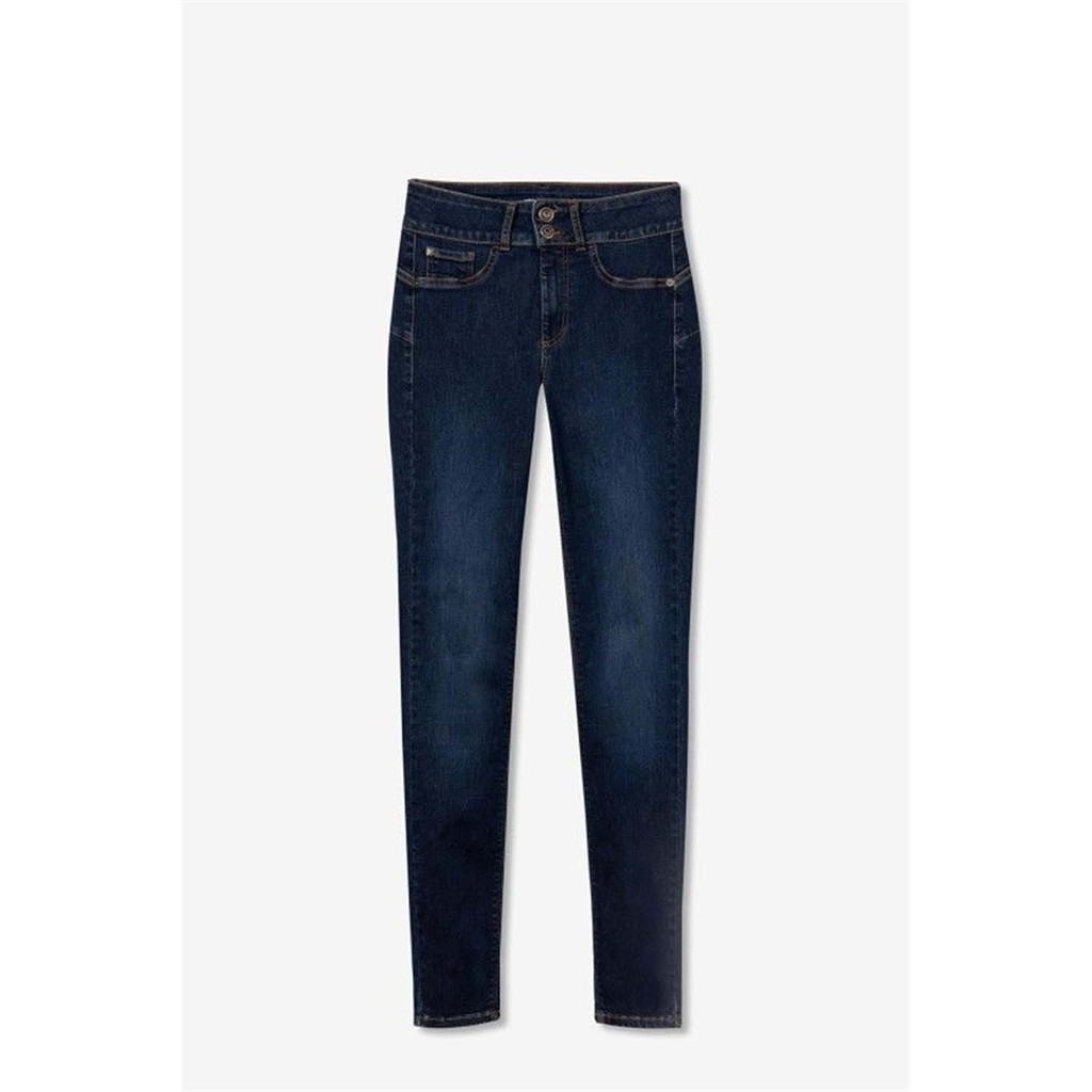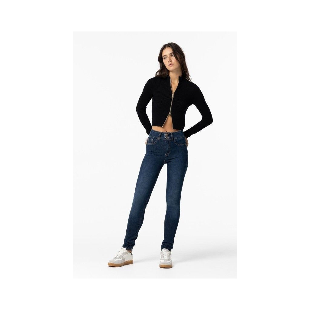 Jeans ajustados de tiro alto con tres bolsillos. Cierre frontal con cremallera y botones metálicos. Bolsillos falsos delanteros. Efecto push-up.