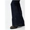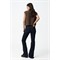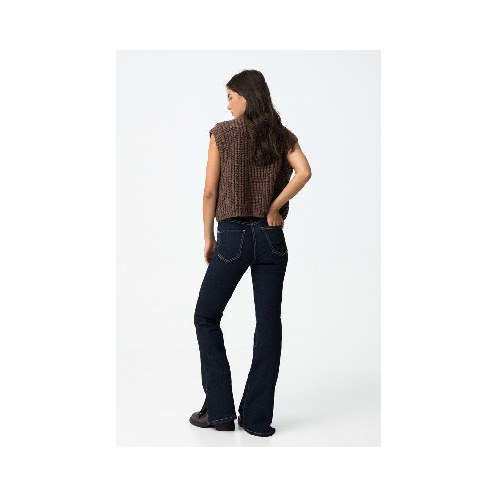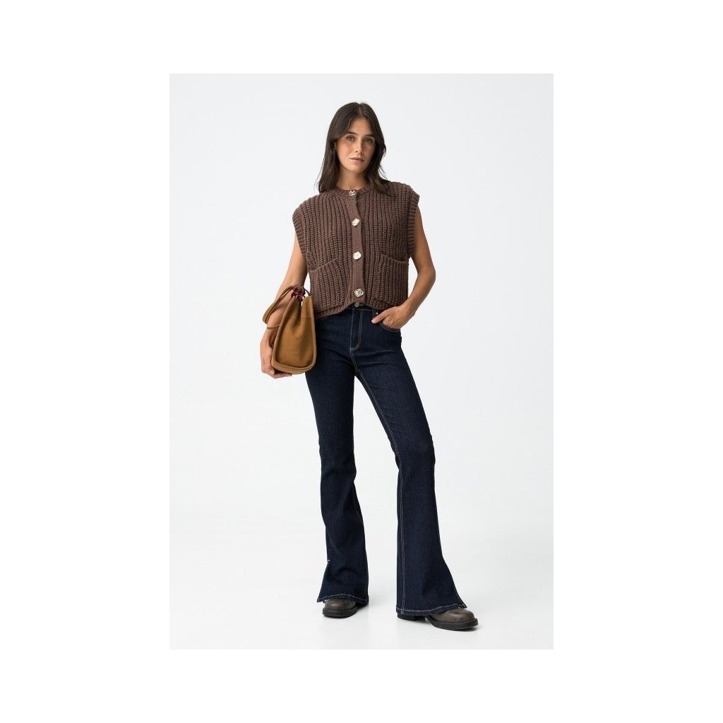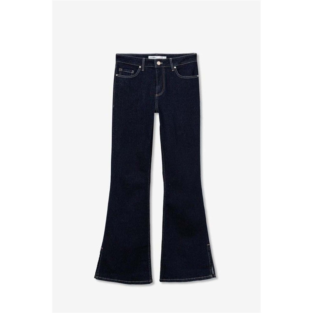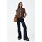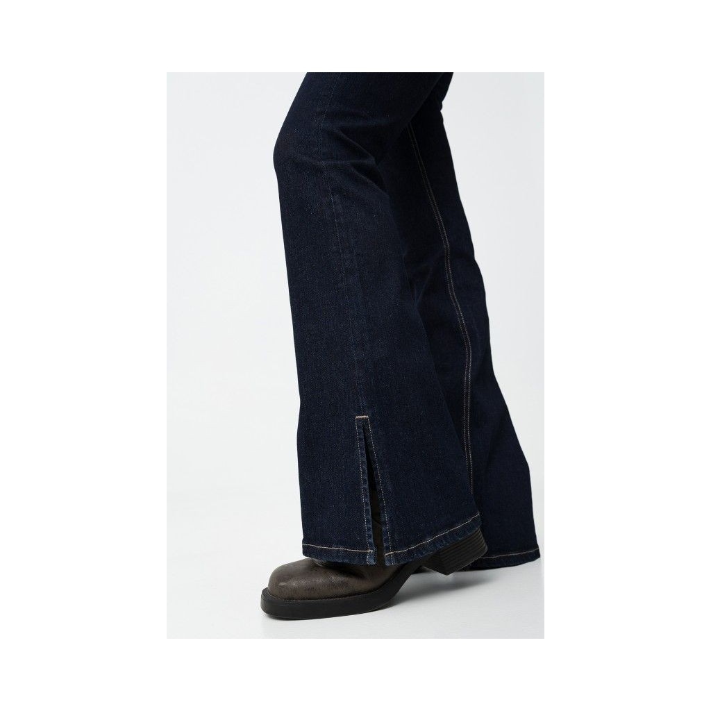Vaqueros de corte flare en azul oscuro, con diseño de cinco bolsillos y cierre de botón metálico.