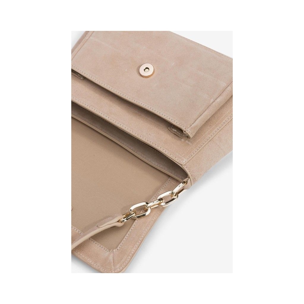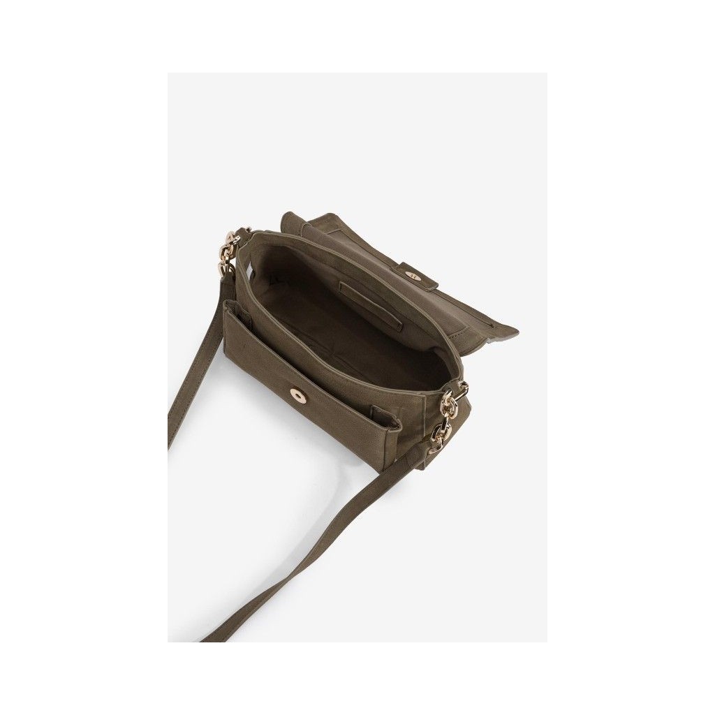 Bolso bandolera de ante, con bolsillo frontal y solapa con cierre magnético. Correa ajustable combinada con cadena.