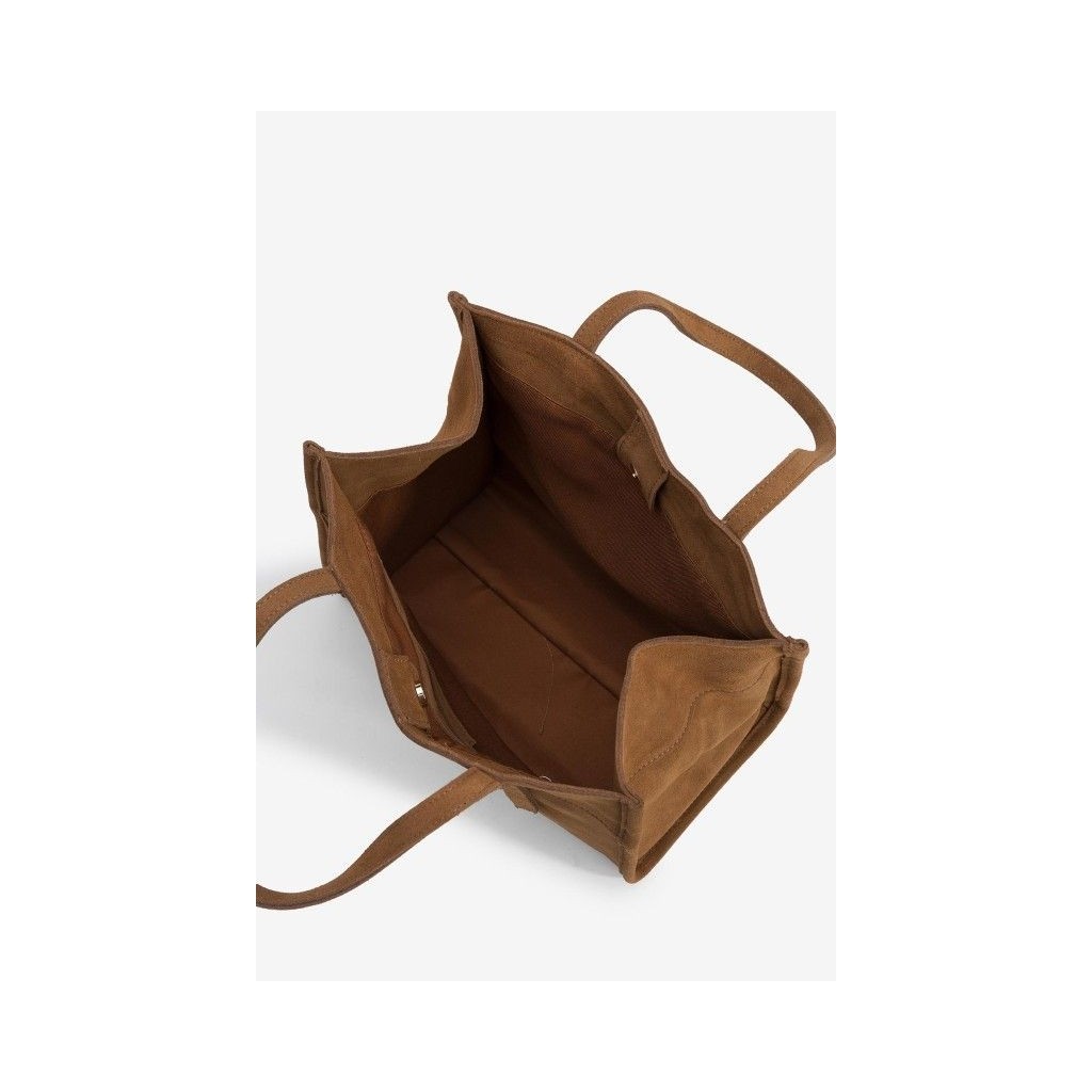 Bolso shopper de ante con cierre magnético superior, asas fijas de hombro y bolsillo interior. Tamaño mediano.