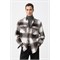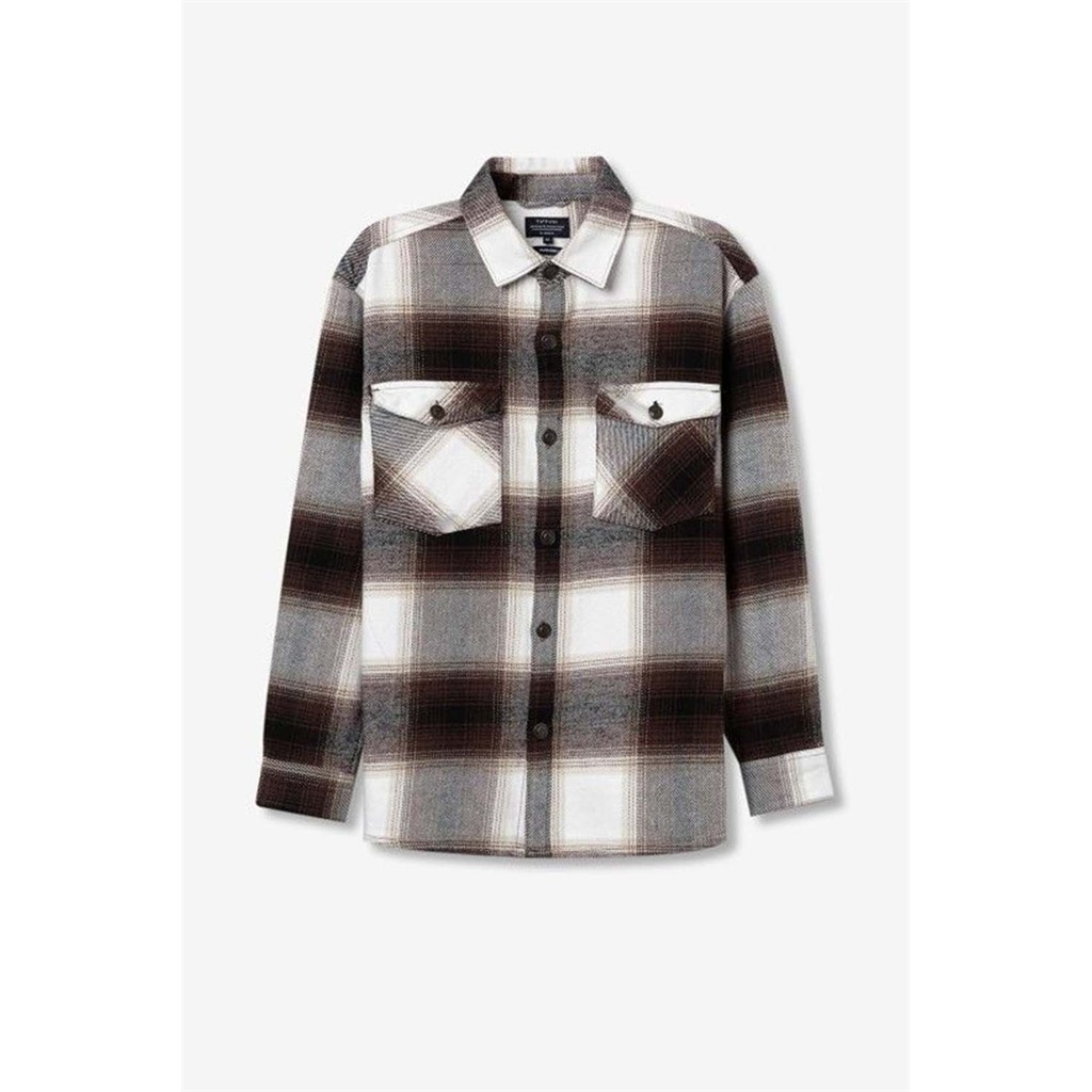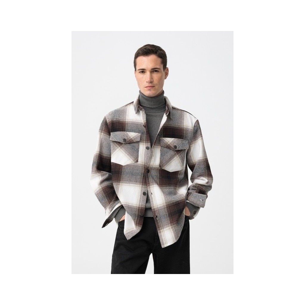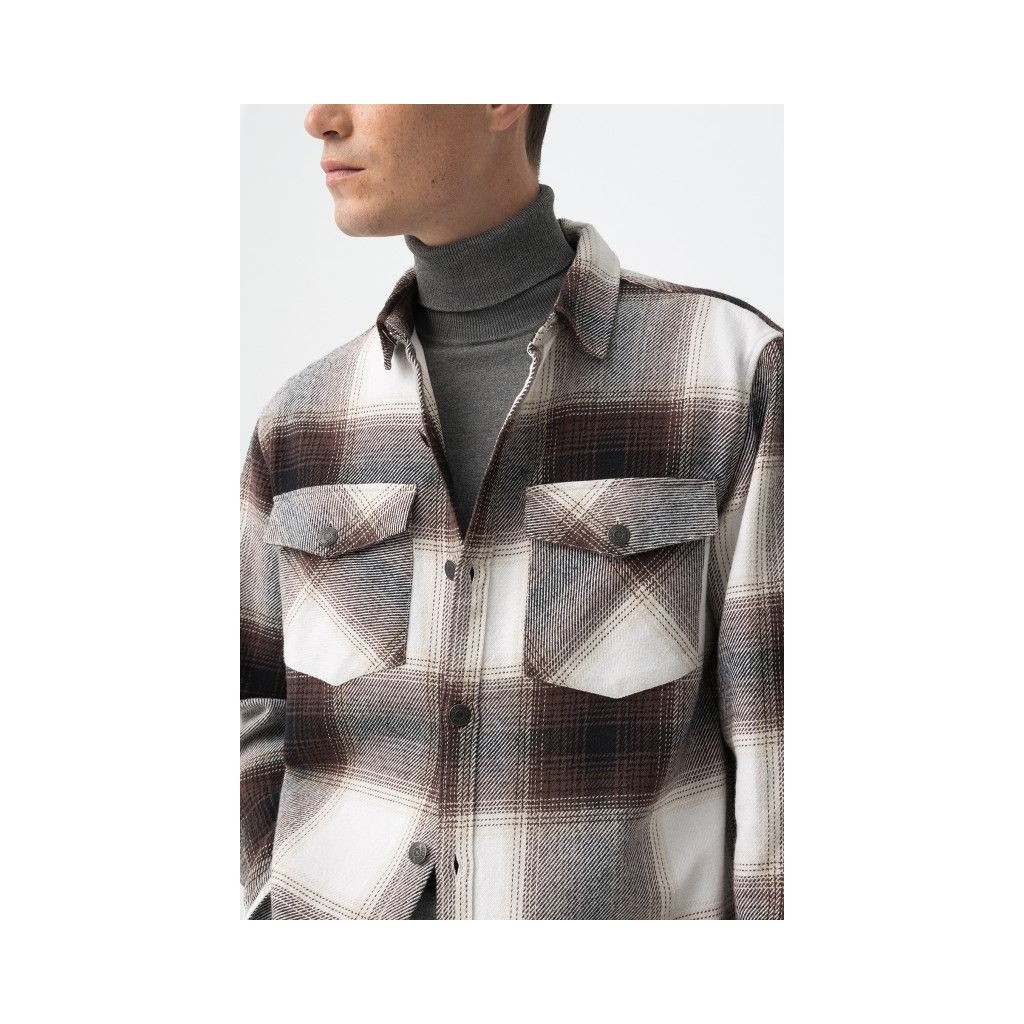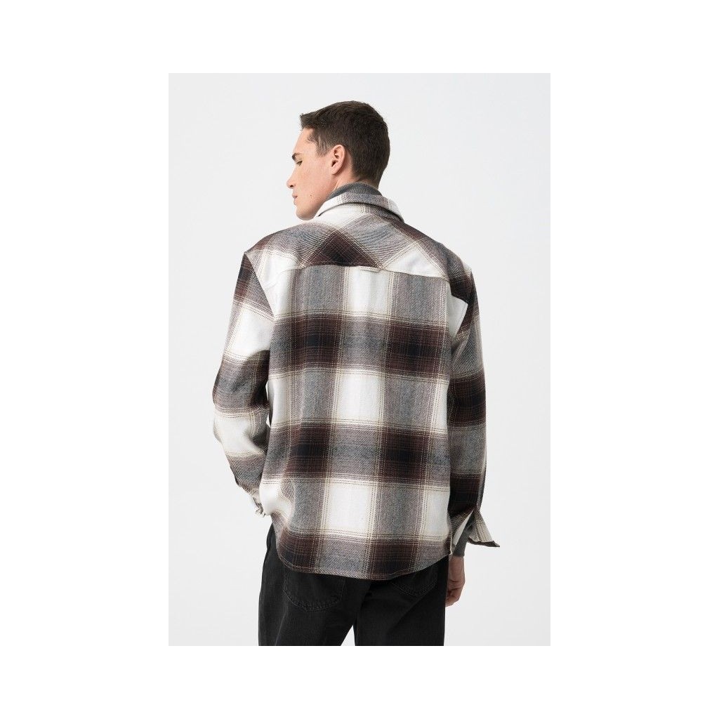 Sobrecamisa oversized de franela de algodón a cuadros, dos bolsillos con solapa en la parte delantera y cierre de botón metálico. Cuello camisero, manga larga con botones en los puños.