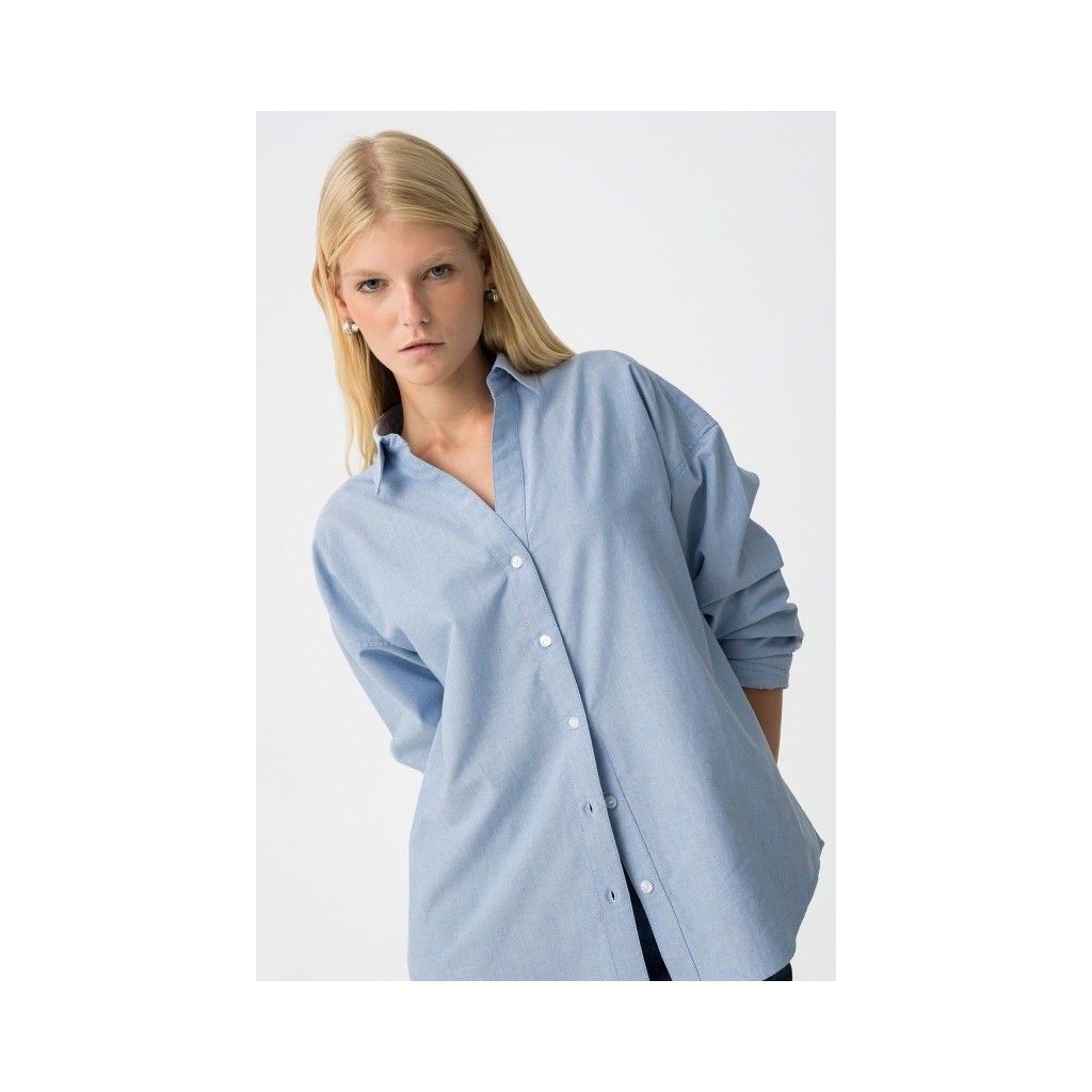 Camisa relaxed fit de popelina con abertura frontal y cierre de botones. Escote en V con cuello, manga larga con botones en los puños y bajo curvado.