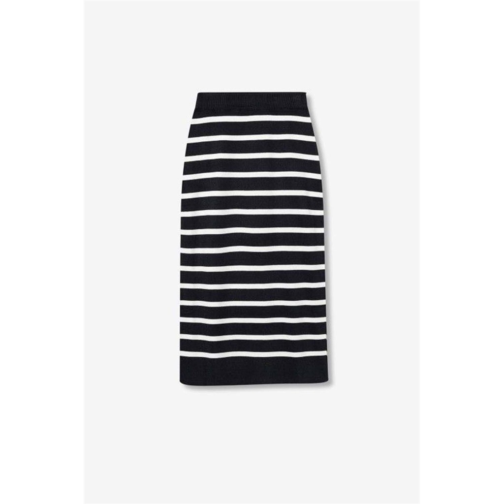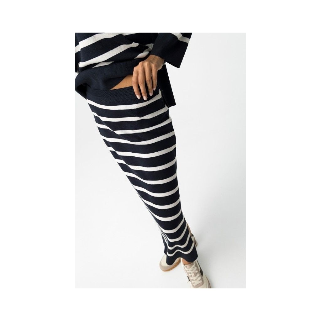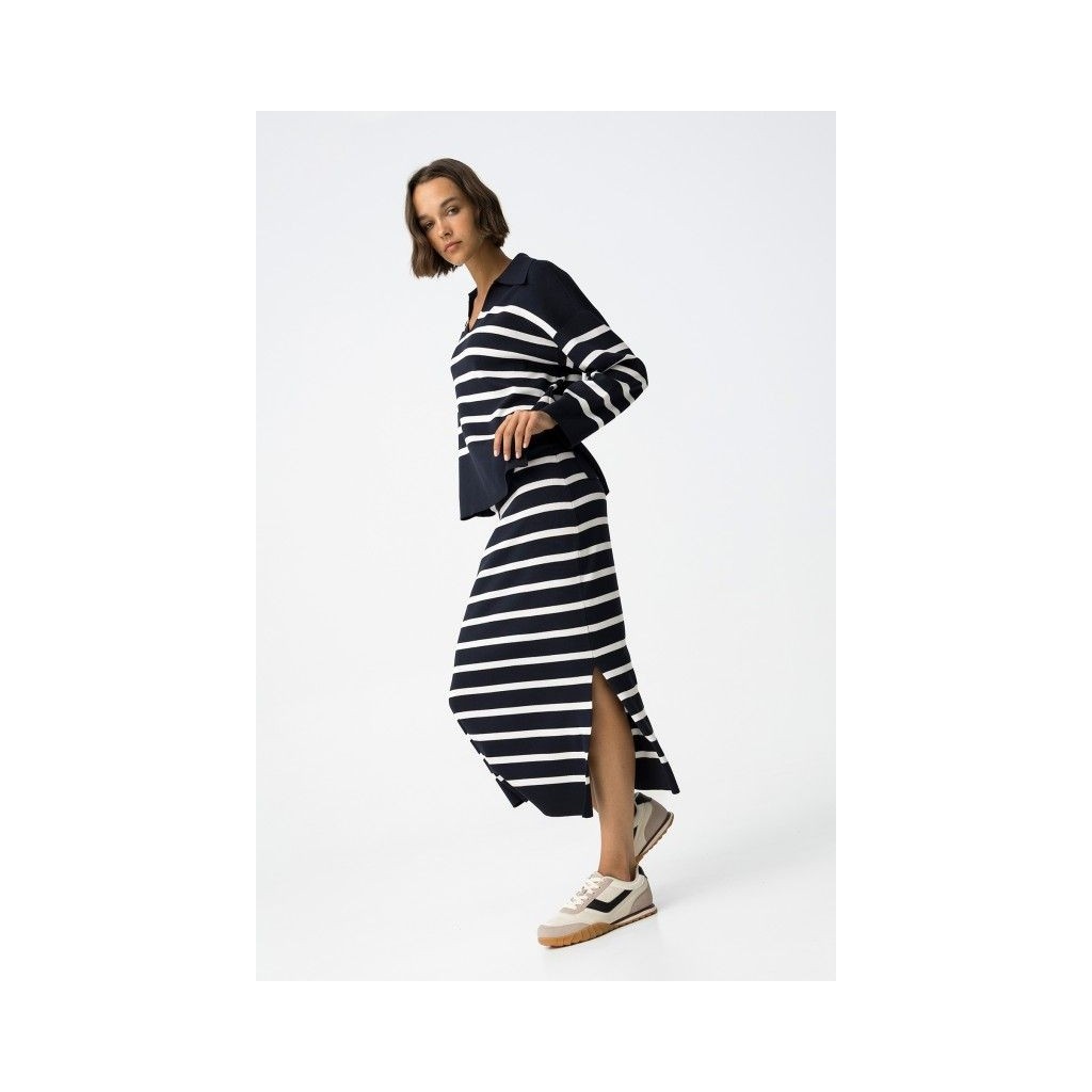 Falda midi regular fit de punto a rayas. Con cintura alta elástica y abertura lateral en el bajo.