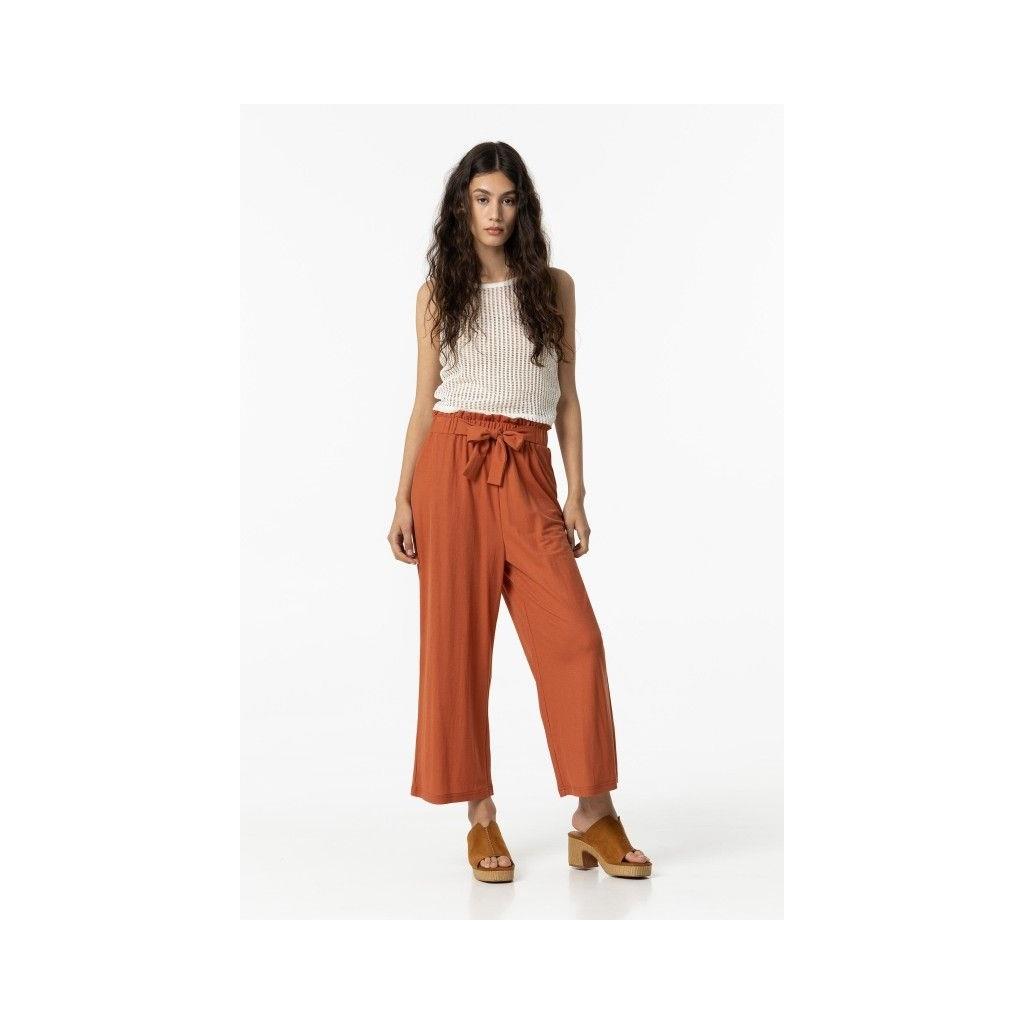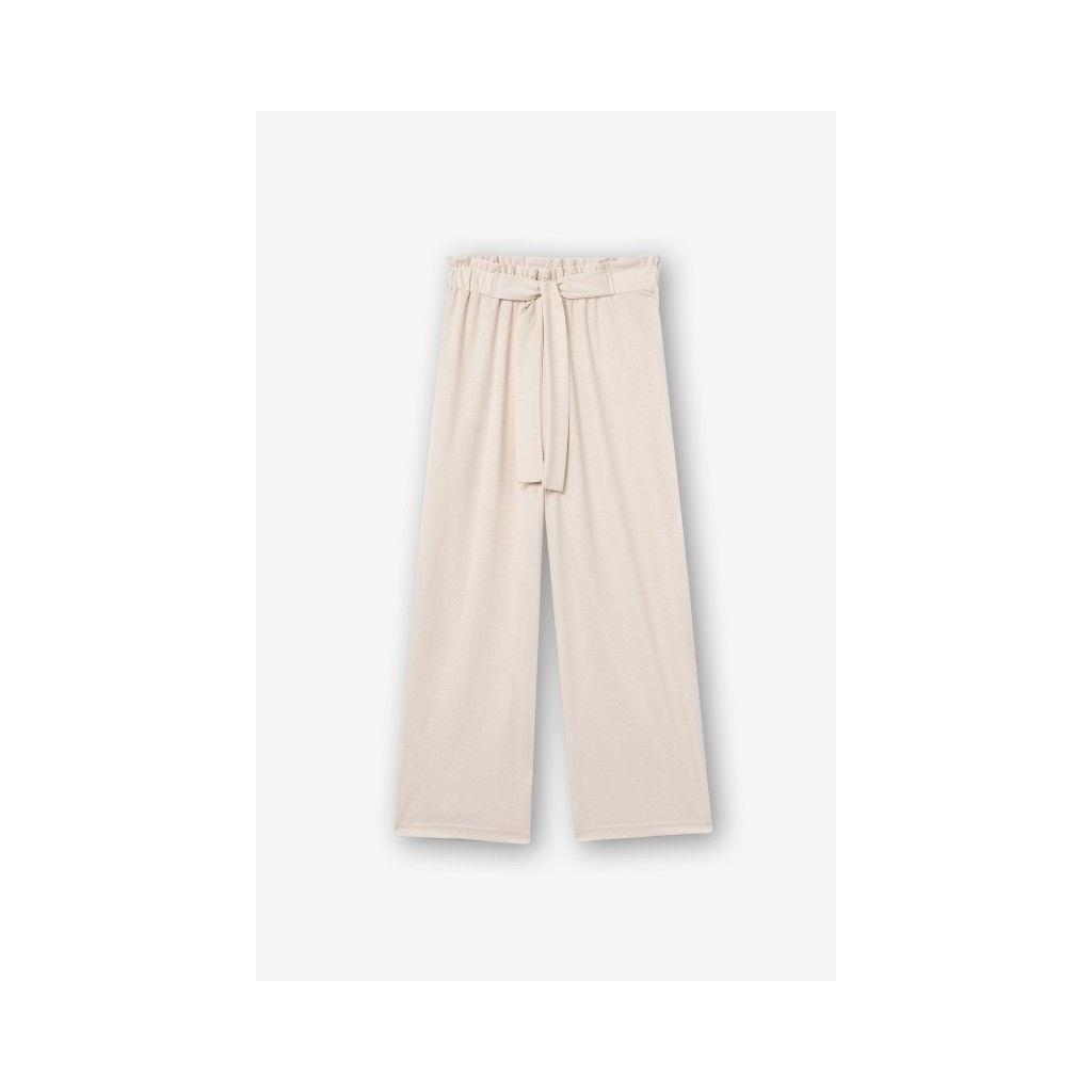 Pantalón de tiro alto con cinturilla elástica. Aplicación de cinturón del mismo tejido.